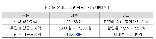 다음 주에 있는 라온테크 확정 공모가가 나왔더라구요. 엘비루셈이 한투랑 KB증권에서 청약을 받았는데, 라온테크도 KB증권에서 받더라구요! 환불받은 금액으로 바로 청약을 할만한 종목인지 살펴보도록 하겠습니다.