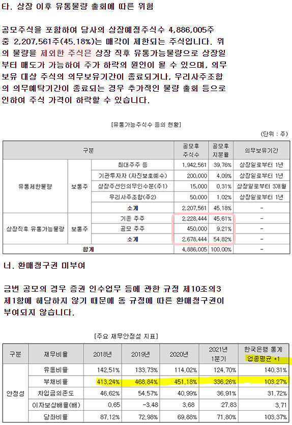 수요예측 결과를 보고 괜찮은가 싶었는데 (의무보유 확약은 요즘 보통 낮아서..), 확정 공모가가 희망 공모가 상단 대비 13~14%이나 높게 설정된 게 사실 마음에 안듭니다..허허 게다가 유통 물량으로 투펀치. 유통 물량이 많으면 상장 당일에 많은 부담이 됩니다. 제가 상장 하는 날 일이 있어서, 더 걱정이 되네요.