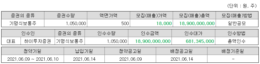 하이투자증권에서 청약이 진행된다고 합니다. 모집총액은 189억입니다. 공모가가 확정되었는데 18,000원입니다. 희망공모가 최상단이네요. 수량은 105만주 입니다.