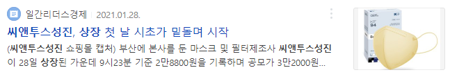 | 제주맥주 공모주 청약 배정 결과 / 씨앤씨인터내셔널 코스닥 상장 첫 날 12%이상 하락 (0) | 2021.05.17 |