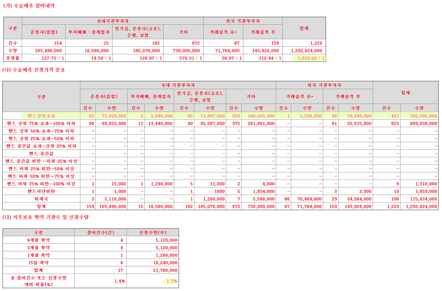 앞서 수요예측, 의무보유 확약 비율을